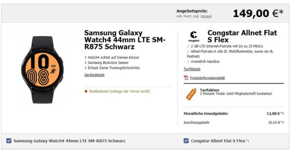 *SCHNELL EFF.99€ ERSPARNIS* *MTL. KÜNDBAR* Galaxy Watch 4 LTE 44mm + 2 GB LTE + Alles-Flat im Telekom-Netz für 12€/Monat