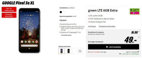 Neues Smartphone inkl. Tarif im Telekom-Netz gesucht? Bei MediaMarkt bekommt ihr gerade das GOOGLE Pixel 3a XL inkl. 6GB LTE + Telefon-Flat + Hotspot-Flat im Telekom-Netz für 16,99€/Monat.