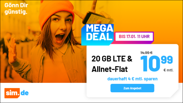 Bei SIM.de, einer Marke der Drillisch AG (Handyvertrag.de, Simply & Co.), bekommt ihr die 20GB LTE Allnet-Flat für 10,99€/Monat (auch ohne Vertragslaufzeit!). 🙂