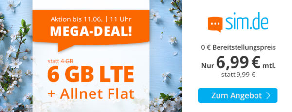 Bei SIM.de, einer Marke der Drillisch AG (Handyvertrag.de, Simply & Co.), erhaltet ihr die 6GB LTE Allnet-Flat für 6,99€/Monat (auch ohne Vertragslaufzeit!). 🙂
