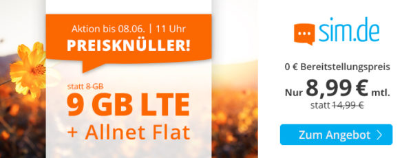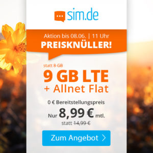 Bei SIM.de, einer Marke der Drillisch AG (Handyvertrag.de, Simply & Co.), erhaltet ihr die 9 GB LTE Allnet-Flat für 8,99€/Monat (auch ohne Vertragslaufzeit!). 🙂