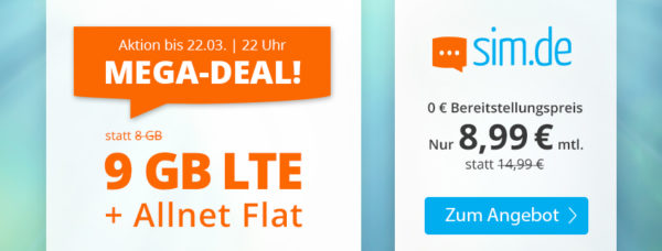 Bei SIM.de, einer Marke der Drillisch AG (Handyvertrag.de, Simply & Co.), erhaltet ihr die 9GB LTE Allnet-Flat für 8,99€/Monat (auch ohne Vertragslaufzeit!). 🙂