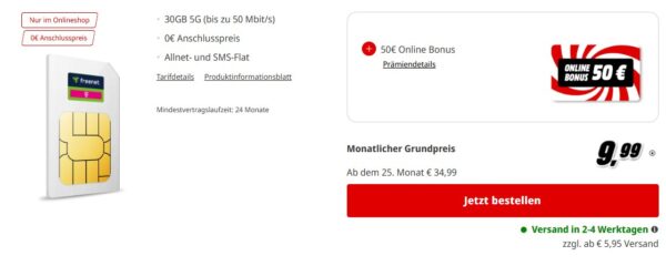*SIM-ONLY* 30GB 5G + Alles-Flat im Telekom-Netz für 9,99€/Monat – eff. 8,15€/Monat