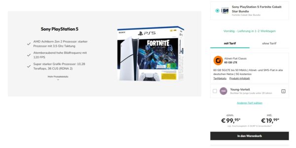 Schönes Ding von Sparhandy, dort bekommt ihr die Sony Playstation 5 + 60GB 5G + Allnet-Flat im VF-Netz für 19,99€/Monat
