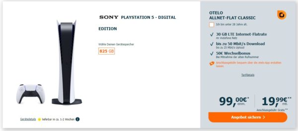 Sony Playstation 5 Digital Edition + 30GB LTE + Alles-Flat im Vodafone-Netz für 19,99€/Monat – eff. 4,32€/Monat