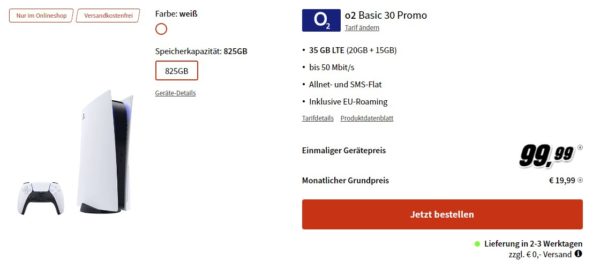 Bei MediaMarkt erhaltet ihr die SONY PlayStation 5 Disc Edition + 35 GB LTE AllnetFlat (O2) für 19,99€/Monat!
