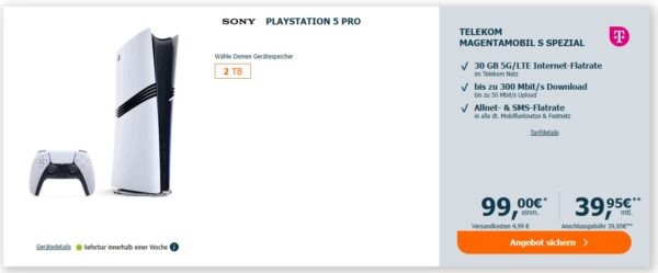 Sony Playstation 5 Pro + 30GB 5G + Alles-Flat im Telekom-Netz für 39,95€/Monat – eff. 5,99€/Monat
