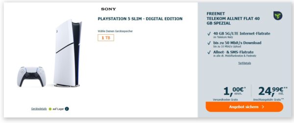 Sony Playstation 5 Slim Digital Edition (1TB) + 40GB 5G + Alles-Flat im Telekom-Netz für 24,99€/Monat – eff. 2,31€/Monat
