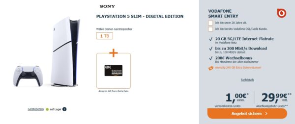 SONY PlayStation 5 Slim (Digital Edition) + 20 GB 5G AllnetFlat (VF) für 29,99€/Monat + 60€ Amazon.de-Gutschein
