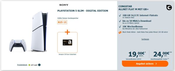 Sony PlayStation 5 SLIM – Digital Edition + 30€ Amazon Gutschein* + 200GB 5G + Alles-Flat im Telekom-Netz für 24€/Monat