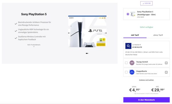 Sony Playstation 5 Slim (Disc-Edition) + 25GB LTE/5G + Alles-Flat im o2-Netz für 29,99€/Monat – eff. 9,70€/Monat