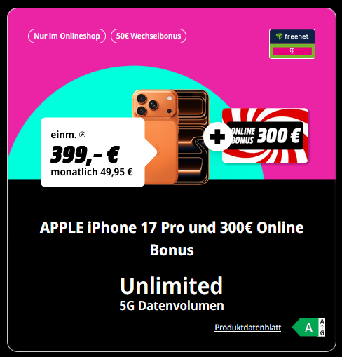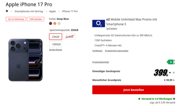 Stark! MediaMarkt läutet das Wochenende mit einem guten Tarif ein, das Apple iPhone 17 Pro + Unbegrenztes 5G + Alles-Flat im Telekom-Netz für 49,95€/Monat.