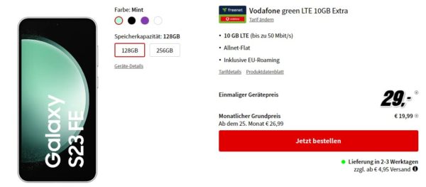 Starkes Angebot seitens MediaMarkt, dort bekommt ihr das Samsung Galaxy S23 FE + 10GB LTE + Telefon-Flat im Vodafone-Netz für 19,99€/Monat