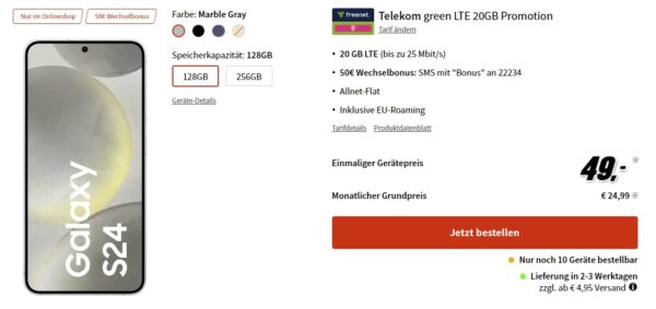 Starkes Angebot seitens MediaMarkt, dort bekommt ihr das Samsung Galaxy S24 + 20GB LTE + Telefon-Flat im Telekom-Netz für 24,99€/Monat