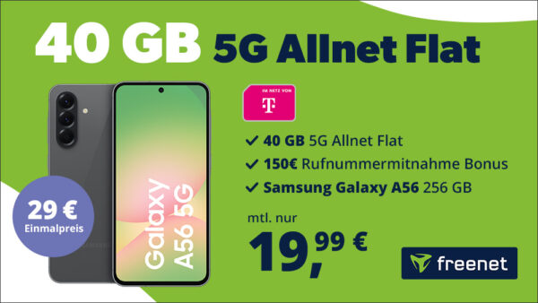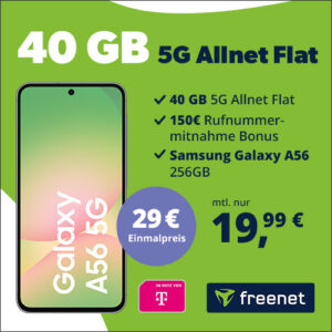 *STARK* Samsung Galaxy A56 (256GB) + 40GB 5G + Alles-Flat im Telekom-Netz für 19,99€/Monat – eff. 1,07€/Monat