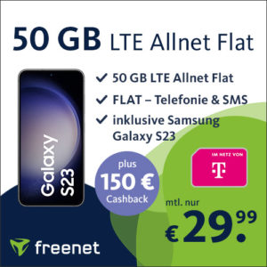 Da haut freenet mal wieder ein starkes Angebot raus, ihr bekommt das Samsung Galaxy S23 + 50GB LTE + Alles-Flat im Telekom-Netz für 29,99€/Monat