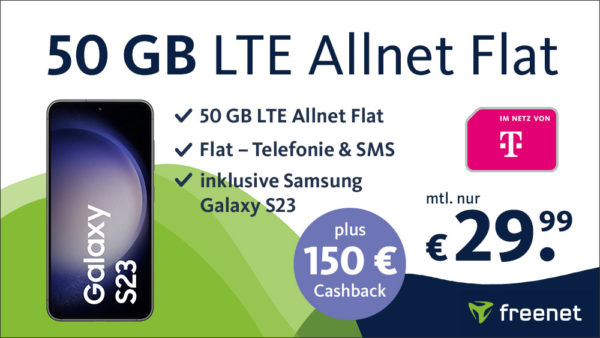*ENDET HEUTE* Samsung Galaxy S23 + 150€ Cashback + 50GB LTE + Alles-Flat im Telekom-Netz für 29,99€/Monat – eff. 4,61€/Monat
