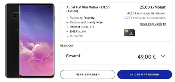 - + 49,00€ Zuzahlung für das Samsung Galaxy S10 (128 GB)