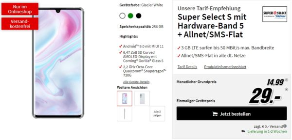 Denn bei MediaMarkt Tarifwelt bekommt man den Super Select S-Tarif (3 GB LTE, Allnet, Telefonica-Netz) inkl. Xiaomi Mi Note 10 Pro für 14,99€/Monat – eff. 47,90€ Ersparnis.