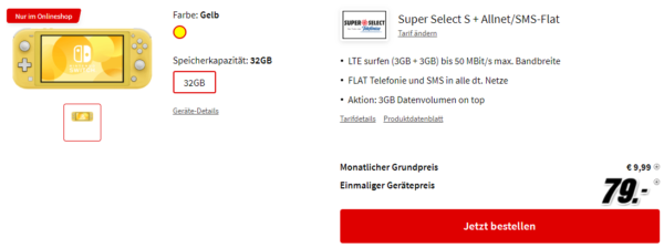 Denn in der MediaMarkt Tarifwelt bekommt man den Super Select S-Tarif (Allnet- & SMS-Flat, 6 GB LTE) inkl. Nintendo Switch Lite für 9,99€/Monat – eff. 7,03€/Monat.