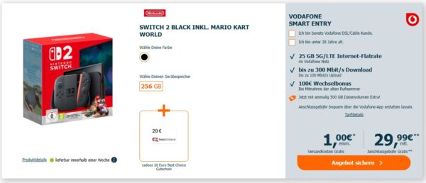 Switch 2 Konsole inkl. Mario Kart World + 20€ BestChoice-Gutschein + 25GB 5G + Alles-Flat im Vodafone-Netz für 29,99€/Monat – eff. 3,99€/Monat