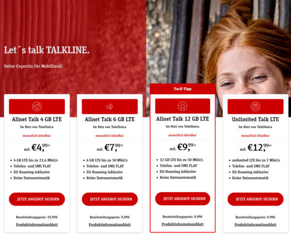 Nachdem Talkline ein paar Jahre von der Bildfläche verschwunden war, ruft die Motion TM die Marke nun mit neuem Design und sehr guten monatlich kündbaren Tarifen im Telefónica-Netz wieder zurück ins Leben. Das Tarifportfolio startet bei 4GB und geht hin bis zu Unlimited Datenvolumen.