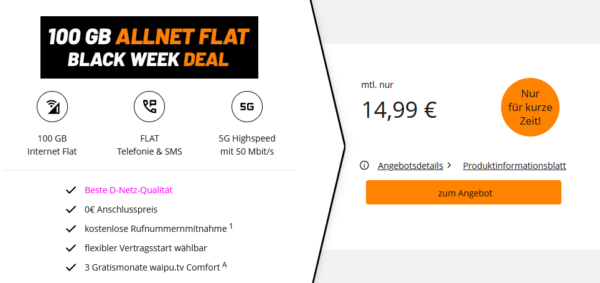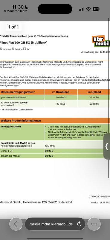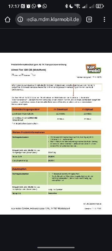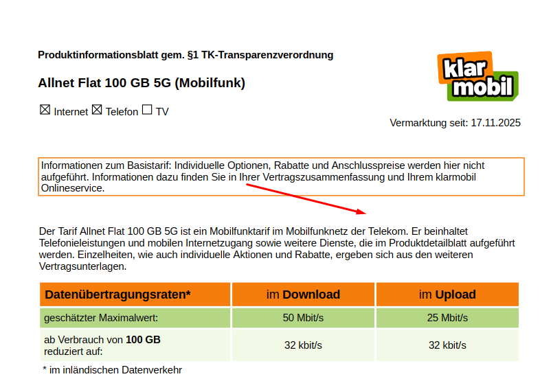 verlinkt auf https://media.mdm.klarmobil.de/cdn?name=allnet-flat-100-gb-5g-produktinformationsblatt&version=17c3be6d770ebd452dbbe14b641b0128dfd3c5a2&extension=pdf&_gl=1*183qoq2*_gcl_au*MTY5MTgyODkyNy4xNzY0MDk2MTI2*_ga*MTE3NjAwNDM0NC4xNzY0MDk2MTI4*_ga_RYGW3GJJ1B*czE3NjQzNDcyMTYkbzMkZzEkdDE3NjQzNDczMDkkajQ1JGwwJGg3NzI3MTc0OQ..*_fplc*TVh4aUpnWXR4V3RyQzFuYlFVNW90OXNCclM0SDNXJTJGcFBQJTJGeDBab0E1MDVVTFolMkJDdXBmb2slMkYlMkZYVlB3Uk5TTVElMkYyJTJGY2RMWDdKZUp3ZGFzaTZMUlFMdk9qeWFvWEMlMkJYbmdGQ3hSTW1iY1RRTW5IdUU3T2F4Y1hKOUJFVkdBZyUzRCUzRA..