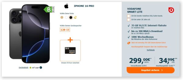 *TARIF EFF. GRATIS* Apple iPhone 16 Pro (128GB) + 50€ Amazon Gutschein* + 35GB 5G + Alles-Flat im Vodafone-Netz für 34,99€/Monat
