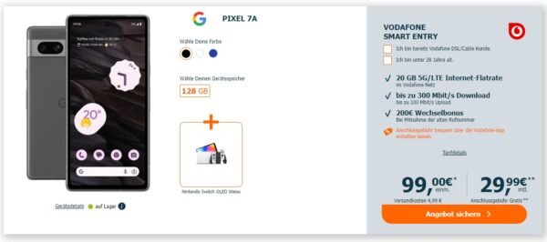*TARIF EFF. GRATIS* Google Pixel 7a + Nintendo Switch OLED + 20GB LTE/5G + Alles-Flat im VF-Netz für 29,99€/Monat + 200€ Bonus