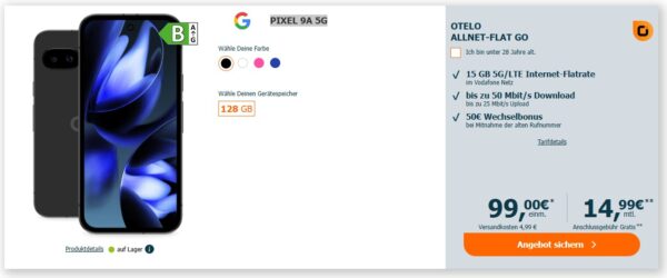 *TARIF EFF. GRATIS* Google Pixel 9A 5G (128GB) + 15GB 5G + Alles-Flat im Vodafone-Netz für 14,99€/Monat