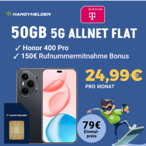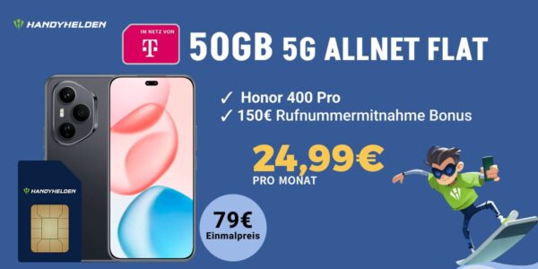 Zum Start in das Wochenende bekommt ihr bei Handyhelden das Honor 400 Pro 12GB/512GB + 50GB 5G + Alles-Flat im Telekom-Netz für 24,99€/Monat