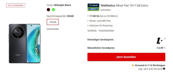 Stark! Bei MediaMarkt bekommt ihr das Honor Magic 6 Lite 5G + 17GB LTE/5G + Alles-Flat im o2-Netz für 6,99€/Monat