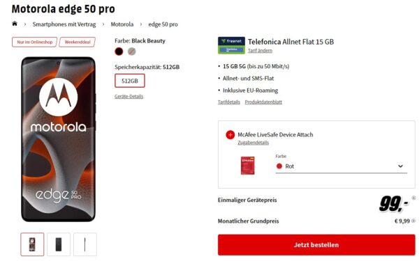 Richtig Starkes Angebot von MediaMarkt, dort bekommt ihr das Motorola edge 50 pro + 15GB LTE/5G + Alles-Flat im o2-Netz für 9,99€/Monat