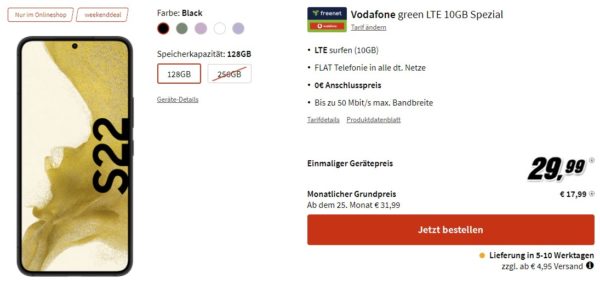 Schönes Angebot von MediaMarkt, dort bekommt ihr das Samsung Galaxy S22 + 10GB LTE + Telefon-Flat im Vodafone-Netz für 17,99€/Monat