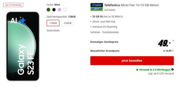 Im Onlineshop von MediaMarkt bekommt ihr das Samsung Galaxy S23 FE + 25GB 5G + Alles-Flat im o2-Netz für 14,99€/Monat