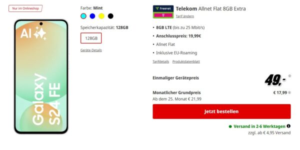 Bei MediaMarkt bekommt ihr das Samsung Galaxy S24 FE + 8GB LTE + Telefon-Flat im Telekom-Netz für 17,99€/Monat
