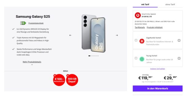 *TARIF EFF. GRATIS* Samsung Galaxy S25 (256GB) + 25GB 5G + Alles-Flat im Vodafone-Netz für 29,99€/Monat