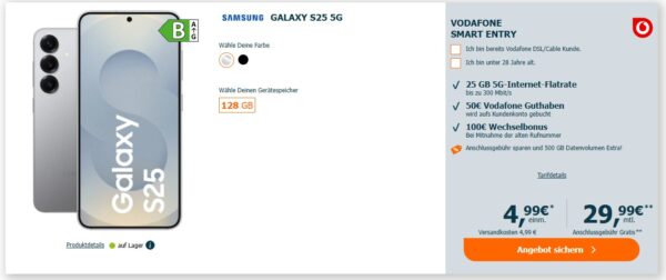 *TARIF EFF. GRATIS* Samsung Galaxy S25 5G 128GB + 25GB 5G + Alles-Flat im Vodafone-Netz für 29,99€/Monat