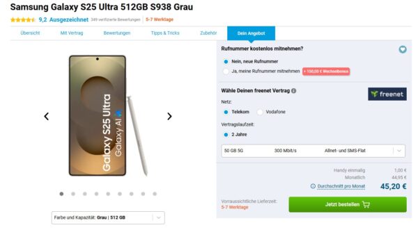 Starker Deal seitens Gomibo, dort bekommt ihr das Samsung Galaxy S25 Ultra (512GB) + 50GB 5G + Alles-Flat im Telekom-Netz für 44,95€/Monat