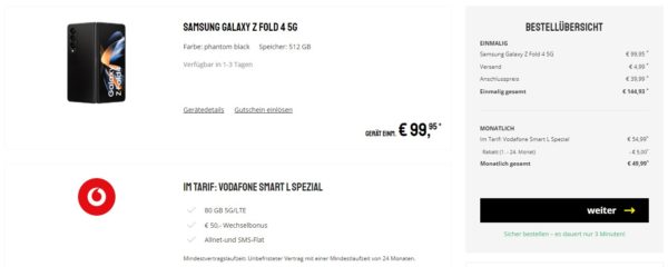 *TARIF EFF. GRATIS* Samsung Galaxy Z Fold 4 5G (512 GB) + 80GB LTE + Alles-Flat im Vodafone-Netz für 49,99€/Monat