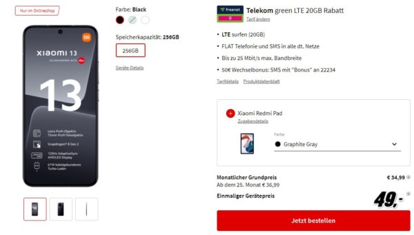 Schönes Angebot bei MediaMarkt, dort bekommt ihr das Xiaomi 13 + Xiaomi Redmi Pad + 20 GB LTE + Alles-Flat im Telekom-Netz für 34,99€/Monat