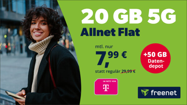 Krass, bei freenet bekommt ihr für kurze Zeit die Telekom 20GB 5G Allnet-Flat für nur 7,99€/Monat