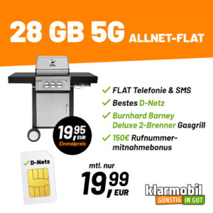 Starkes Angebot von klarmobil für alle Grill-Fans unter euch die auch noch zusätzlich einen Tarif suchen, dort bekommt ihr jetzt den Burnhard Gasgrill + 28GB LTE + Alles-Flat im Telekom-Netz für 19,99€/Monat + 150€ Bonus