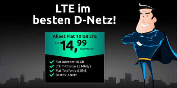 Jetzt erhaltet ihr den Crash-Tarif mit satten 10 GB LTE Datenvolumen und einer Allnet-Flat im besten Netz der Telekom für nur 14,99€ pro Monat! Die Aktionstarife sind meist streng limitiert sodass dieses Angebot recht schnell wieder vorbei sein dürfte… schlagt also schnell zu! 🙂