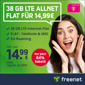 Bei freenet gibt es nur für kurze Zeit eine 38GB Telekom LTE Alles-Flat für 14,99€/Monat!