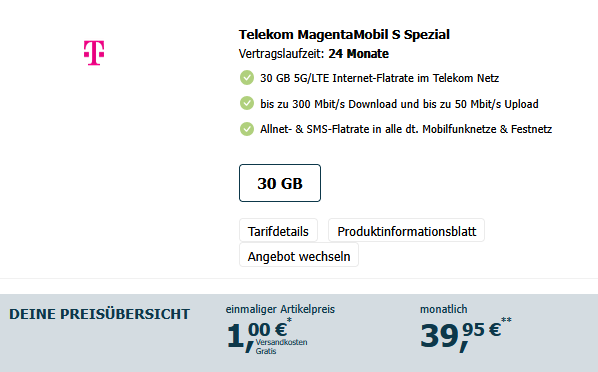 - Surfen: 30 GB 5G Internet-Flatrate (Mit bis zu 300 MBit/s Download