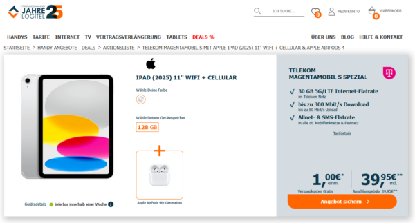 Ihr erhaltet dort nämlich den Telekom MagentaMobil S mit Apple iPad 2025 11“ WiFi + Cellular & Apple AirPods 4 für 39,95€/Monat.