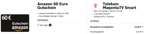 *6 MONATE KOSTENLOS* Telekom MagentaTV Smart-Paket (100 HD-Sender, 50 Aufnahmestunden, RTL+ Premium) inkl. 60€ Amazon.de*-Gutschein oder Magenta TV Stick danach 10€/Monat