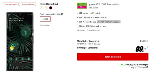 Google Pixel 6 Pro inkl. Tarif im Telekom-Netz gesucht, bei MediaMarkt bekommt ihr das Google Pixel 6 Pro + 14 GB LTE + Telefon-Flat für 29,99€/Monat