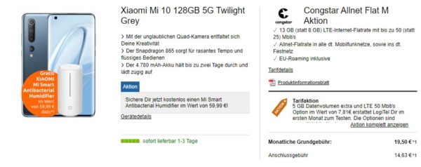 Fazit: Hier bekommt ihr das Xiaomi Mi 10 + Mi Humidifier inkl. 8 GB, Telefon- & SMS-Flat im besten Telekom-Netz für effektiv nur 0,69€/Monat.